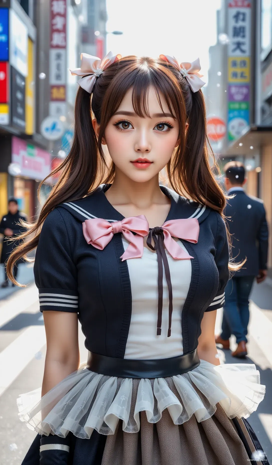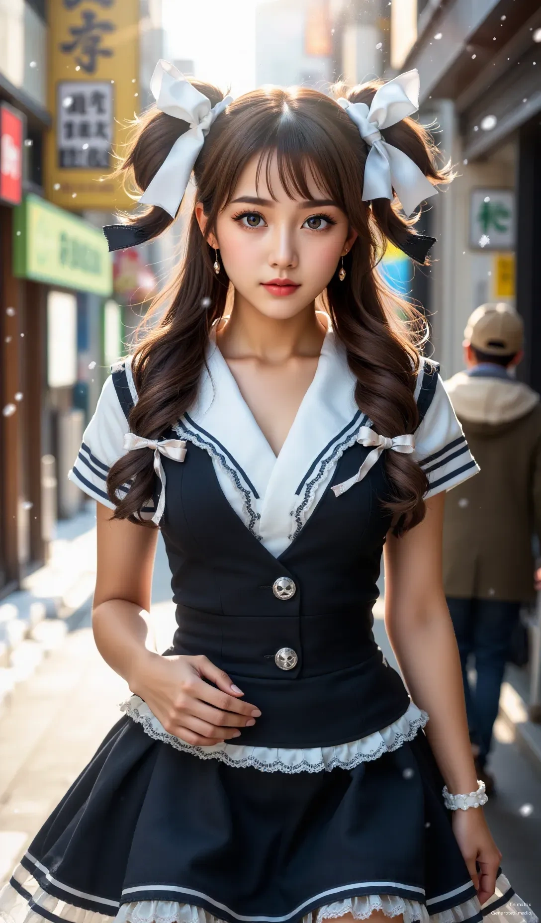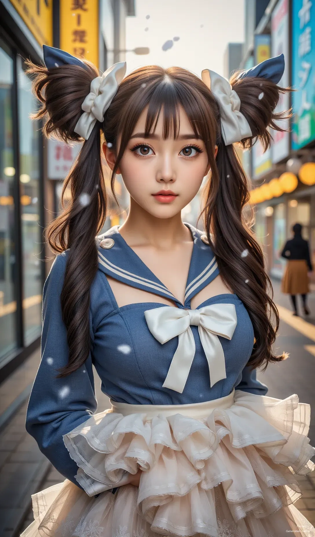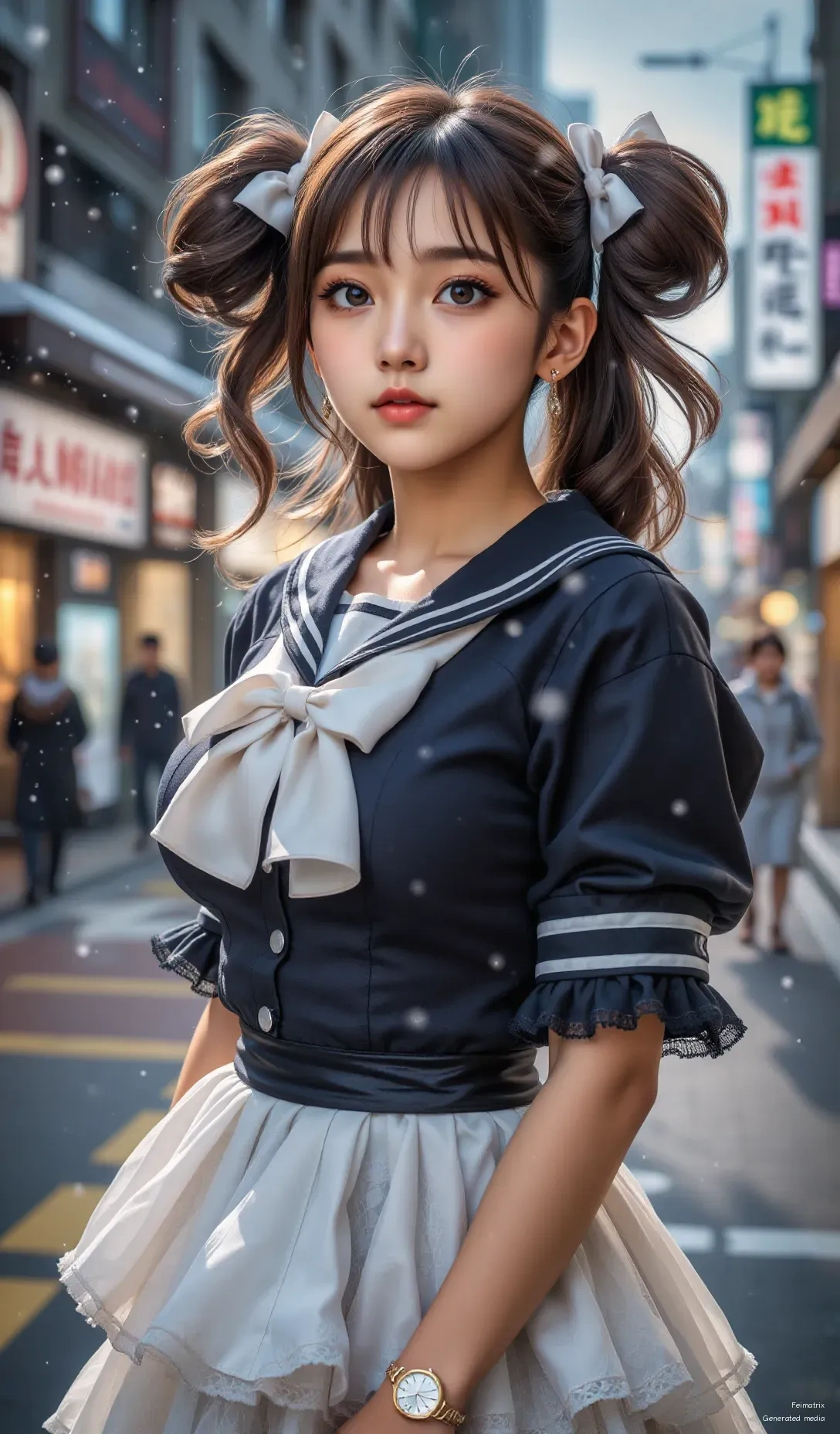 Cinematic Realism: A breathtaking photorealistic portrait of a top-tier Japanese "Oudou" idol with voluminous high twin-tails tied with oversized satin bows. She is wearing a stylized nautical school uniform with an extremely puffy, layered tulle skirt. Standing on a snowy Tokyo street in Ginza, soft snowflakes landing on her hair. 8k resolution, sharp focus, cinematic lighting.